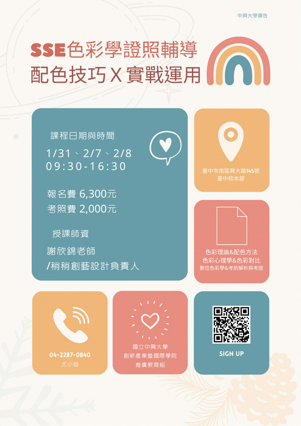 聯絡窗口:國立中興大學創新產業暨國際學院推廣教育組,電話(04)22870840,詳情請參簡章與海報。 |